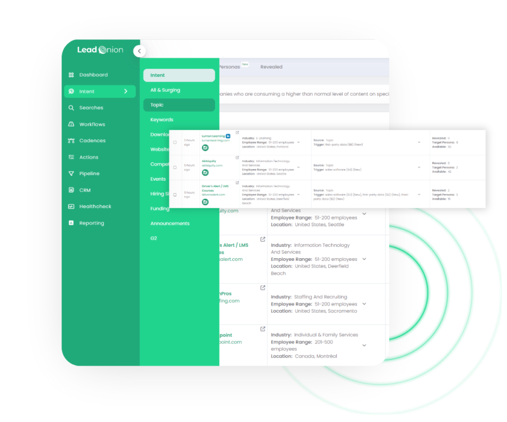 A single setup flow that creates a comprehensive buyer intent campaign, identifies targeted contacts, automates sales cadences, and jumpstarts success with 100 free leads – all within a lightning-fast, under 3-minute setup.