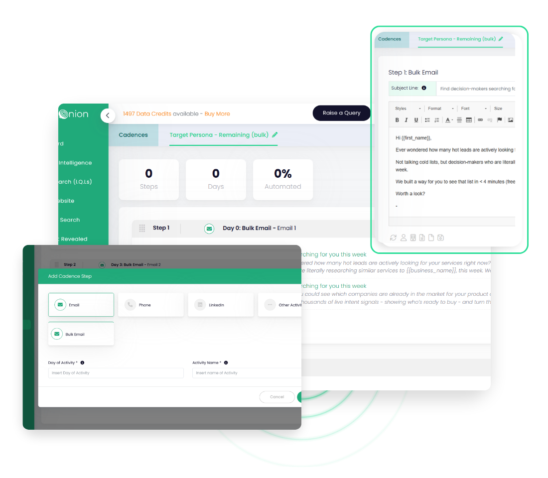 Stay consistent, save time, and keep every follow-up on track. Lead Onion’s Sales Automation Cadences give your team a repeatable structure for every touchpoint, across email, phone, and LinkedIn, so no lead slips through the cracks.